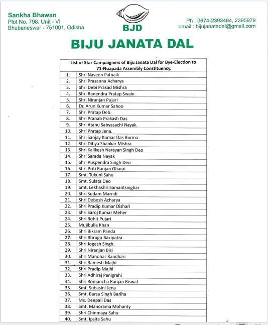ବିଜେଡି ଜାରି କଲା ୪୦ ଜଣିଆ ଷ୍ଟାର୍ ପ୍ରଚାରକ ତାଲିକା